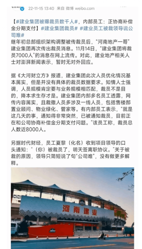 11月14日,有消息傳出河南“地產一哥”建業集團將裁員7000人,多名建業集團內部員工透露:“消息屬實,已經有員工被陸續叫去談話,15日之前簽離職(協議)。”“領導說公司很難,在崗也要降薪40%。”