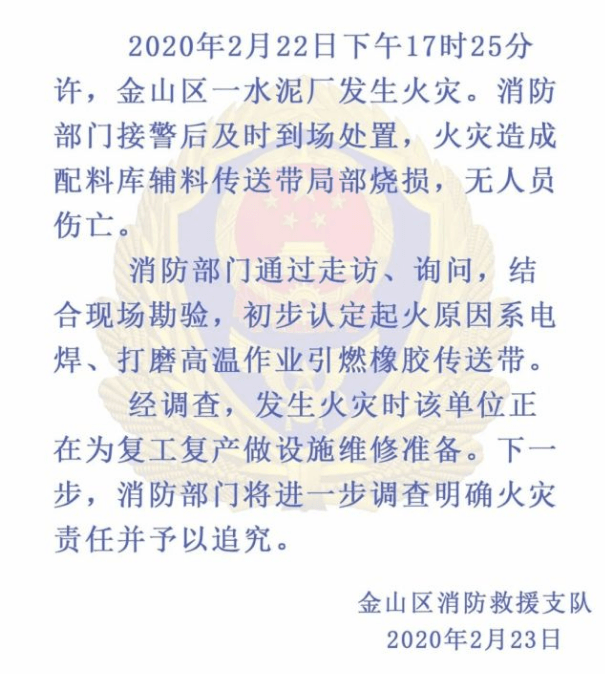 2020年2月22日下午5點25分許,上海金山區(qū)一水泥廠發(fā)生火災(zāi)。消防部門接警后及時到場處置,火災(zāi)造成配料庫輔料傳送帶局部燒損,無人員傷亡。消防部門通過走訪、詢問,結(jié)合現(xiàn)場勘驗,初步認定起火原因系電焊、打磨高溫作業(yè)引燃橡膠傳送帶。