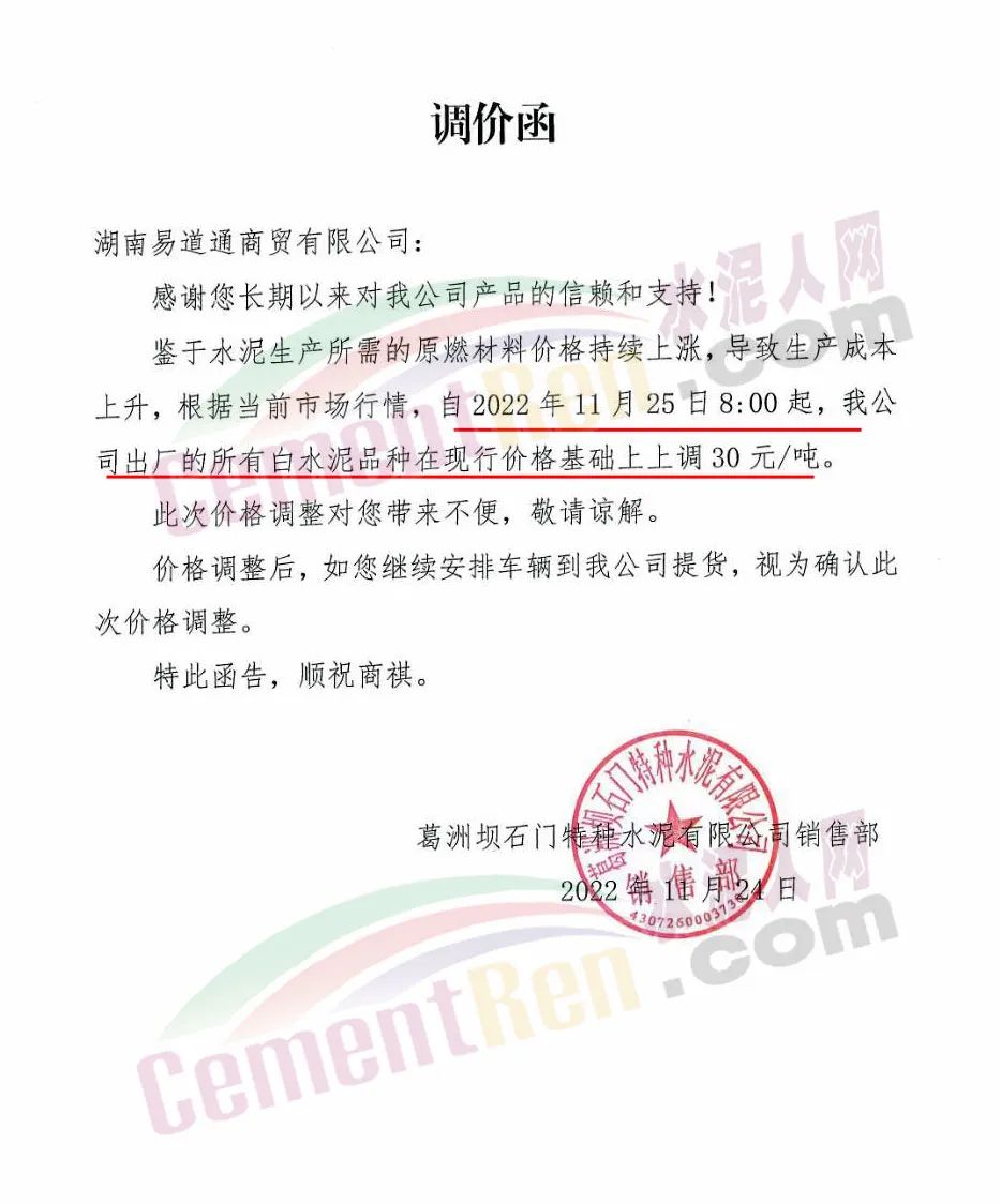葛洲壩石門特種水泥有限公司銷售部通知,鑒于水泥生產所需的原燃材料價格持續上漲,導致生產成本上升,根據目前市場行情 ,自11月25日8時起,公司出廠的白水泥品種在現行價格基礎上上調30元/噸。