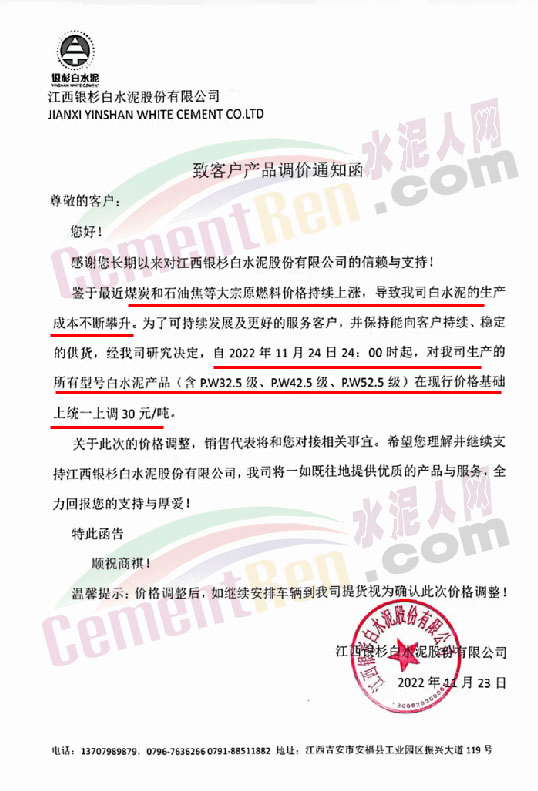 江西銀杉白水泥股份有限公司通知,鑒于最近煤炭和石油焦等大宗原燃料價格持續上漲,導致公司白水泥的生產成本不斷攀升。為了可持續發展及更好地服務客戶,并保持向客戶持續,穩定的供貨,經公司研究決定,自11月24日24時起,對公司生產的所有型號白水泥在現行價格基礎上統一上調30元/噸。