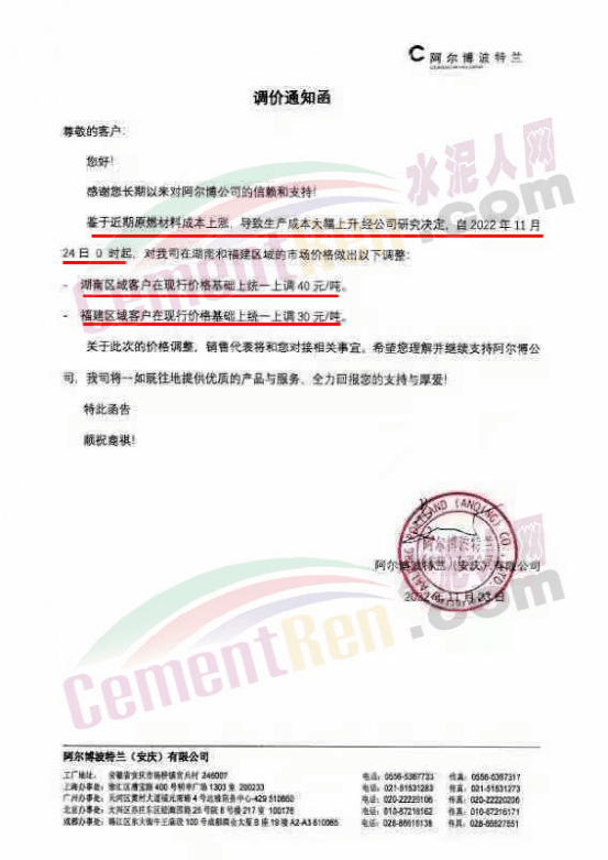 阿爾博波特蘭(安慶)有限公司通知,鑒于近期原燃材料成本上漲,導致生產成本大幅上升經公司研究決定,自11月24日0時起,湖南區域在現行價格基礎上統一上調40元/噸。福建區域在現行價格基礎上統一上調30元/噸。