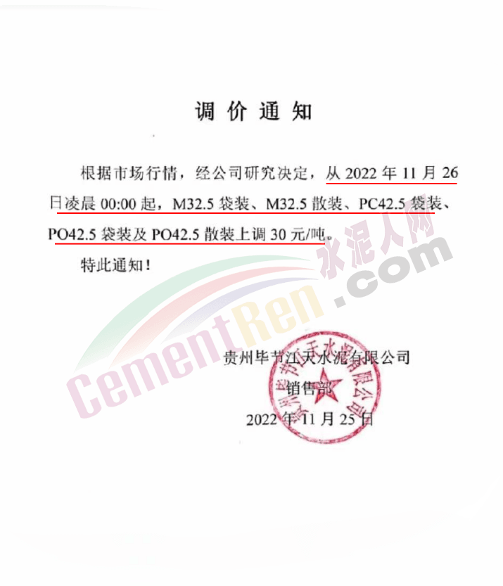 貴州畢節江天水泥有限公司通知從11月26日凌晨0時起,各標號水泥上調30元/噸。