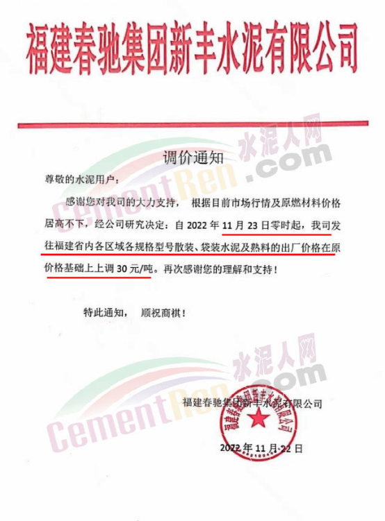同期,福建春馳集團新豐水泥通知根據目前市場行情 及原燃材料價格居高不下,經公司研究決定,自11月23日0時起公司發往福建省各區域各規格型號水泥及熟料出廠價在原基礎上上調30元/噸。