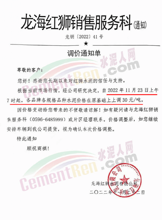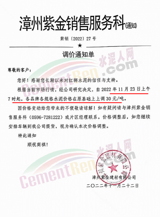 漳州紫金建材、龍海紅獅水泥通知,根據當前市場行情,經公司研究決定,自11月23日上午7時起,各品種各規格水泥價格在原基礎上上調30元/噸。