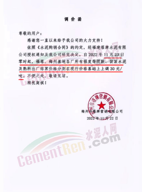 梅州市塔牌營銷有限公司通知自11月23日零時起,福塔、梅州基地各廠所有強度等級水泥及熟料出廠結算價分別在現行價格基礎上上調30元/噸。
