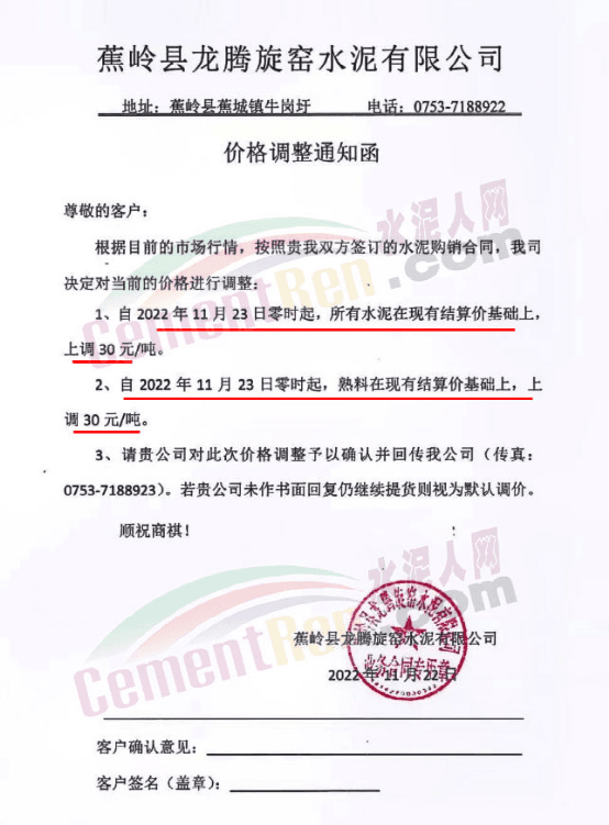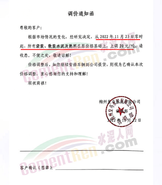 梅州皇馬水泥通知,11月23日零時起,所有水泥及熟料在原價基礎上上調30元/噸。