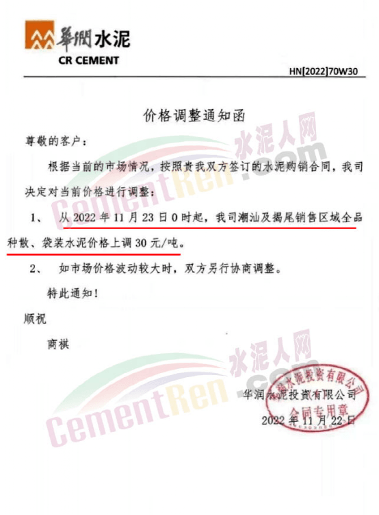 華潤水泥投資有限公司通知自11月23日0時起,公司潮汕及揭尾銷售區域全品種水泥上調30元/噸。