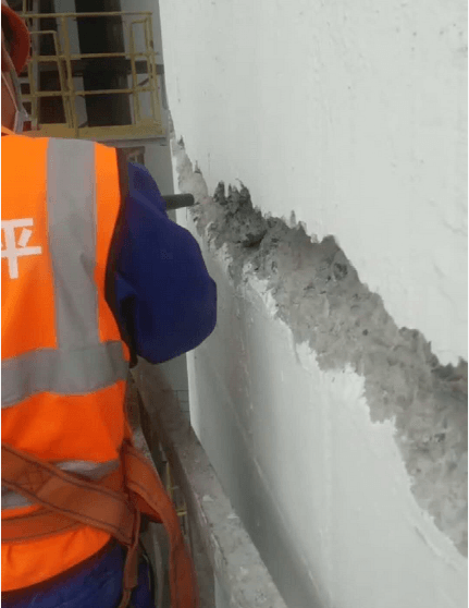 圖:混凝土水泥庫出現裂縫,導致水泥受潮板結嚴重,工人正在修復。