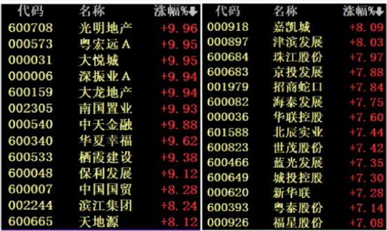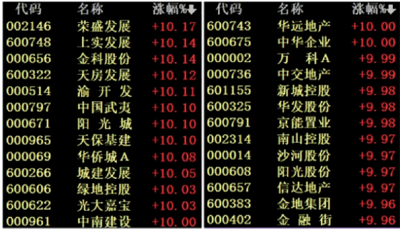 房地產板塊掀起“漲停潮”,中交地產、中國武夷4連板,天房發(fā)展、渝開發(fā)、臥龍地產、空港股份、城建發(fā)展、光大嘉寶、中華企業(yè)、京能置業(yè)、沙河股份、世榮兆業(yè)、陽光股份、信達地產、光明地產、深振業(yè)A、大龍地產、南國置業(yè)競價漲停。港股方面,多只內房股盤中漲超20%。