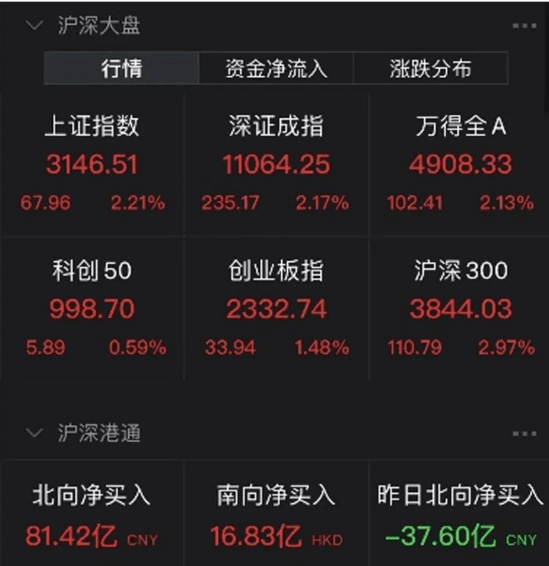 截至上午收盤,上證指數(shù)上漲2.21%,深證成指上漲2.17%,創(chuàng)業(yè)板指上漲1.48%。北向資金凈流入81.42億元。港股也暴漲,恒生科技指數(shù)上午收盤大漲5.45%,重回3600點,恒指、國指分別漲3.85%和4.72%。富時A50期指盤中漲超4%。