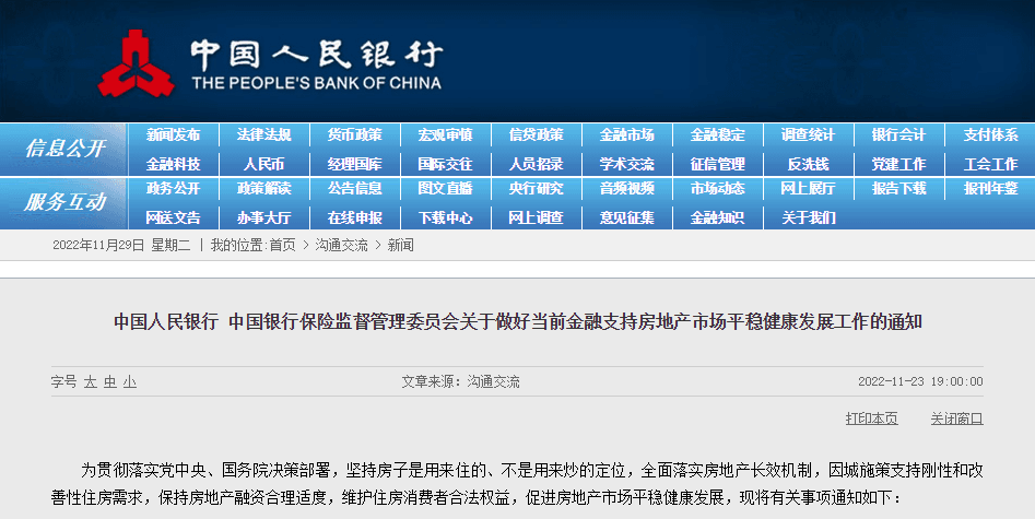 11月23日,《中國人民銀行中國銀行保險監(jiān)督管理委員會關于做好當前金融支持房地產市場平穩(wěn)健康發(fā)展工作的通知》正式發(fā)布。
