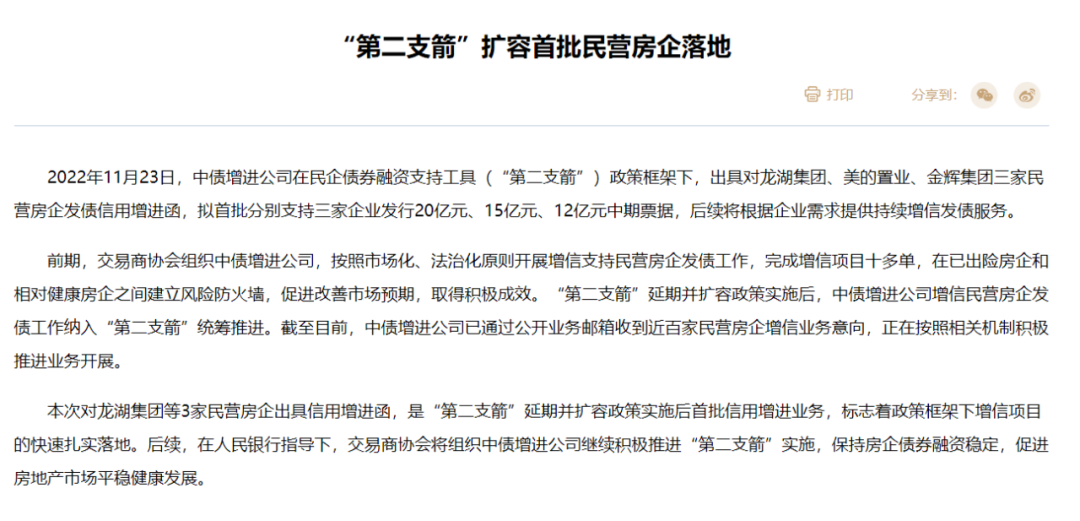 同日,中國銀行間市場交易商協(xié)會發(fā)文稱,已對龍湖集團、美的置業(yè)、金輝集團三家民營房企發(fā)債信用增進函,合計支持三家企業(yè)發(fā)行近50億元的中期票據(jù),后續(xù)將根據(jù)企業(yè)需求提供持續(xù)增信發(fā)債服務。