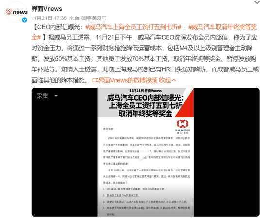 11月21日威馬汽車內(nèi)部信中提到威馬汽車上海員工工資打五至七折。為了應(yīng)對資金壓力,公司管理層帶頭主動降薪一半,其他員工發(fā)放70%的基本工資,取消年終獎等獎金、暫停發(fā)放購車補(bǔ)貼等。同時對公司整體運(yùn)營費(fèi)用進(jìn)行精簡,將通過一系列財(cái)務(wù)措施降低運(yùn)營成本。據(jù)知情人士透露,成都威馬員工或面臨其他降本措施。