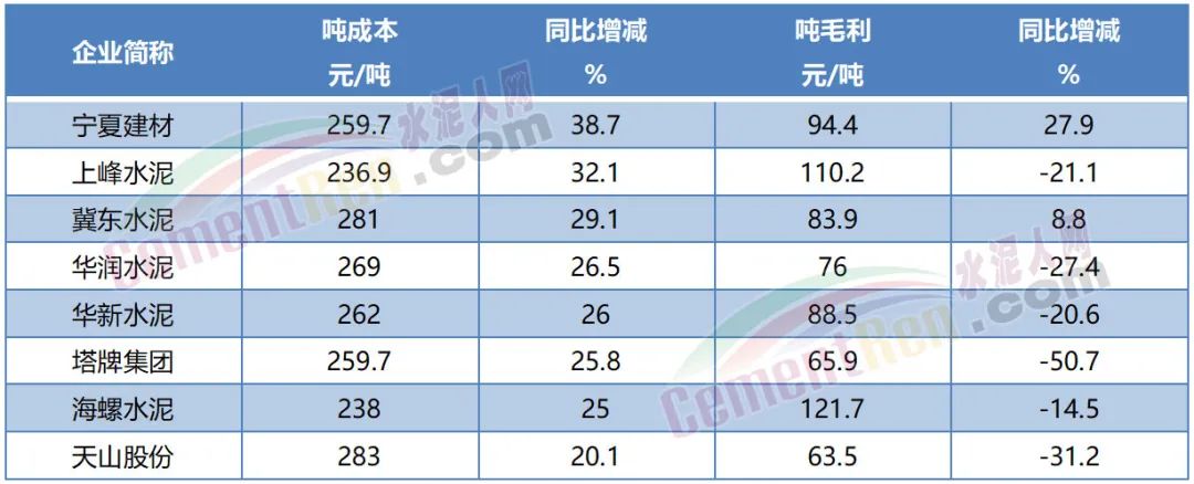 上半年煤、電成本持續高位導致水泥企業成本大幅上漲。上市公司噸成本數據中寧夏建材噸成本同比增加38.7%。