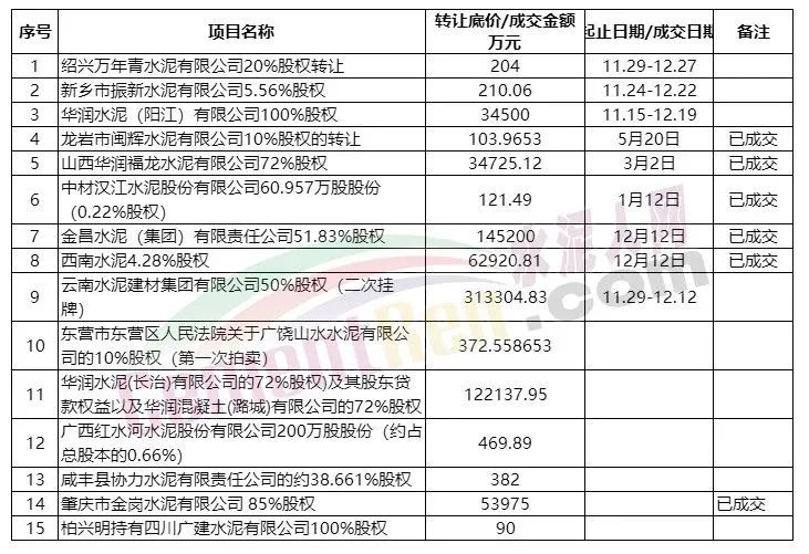 華潤水泥、萬年青水泥、中材水泥等水泥集團企業部分股權公開交易