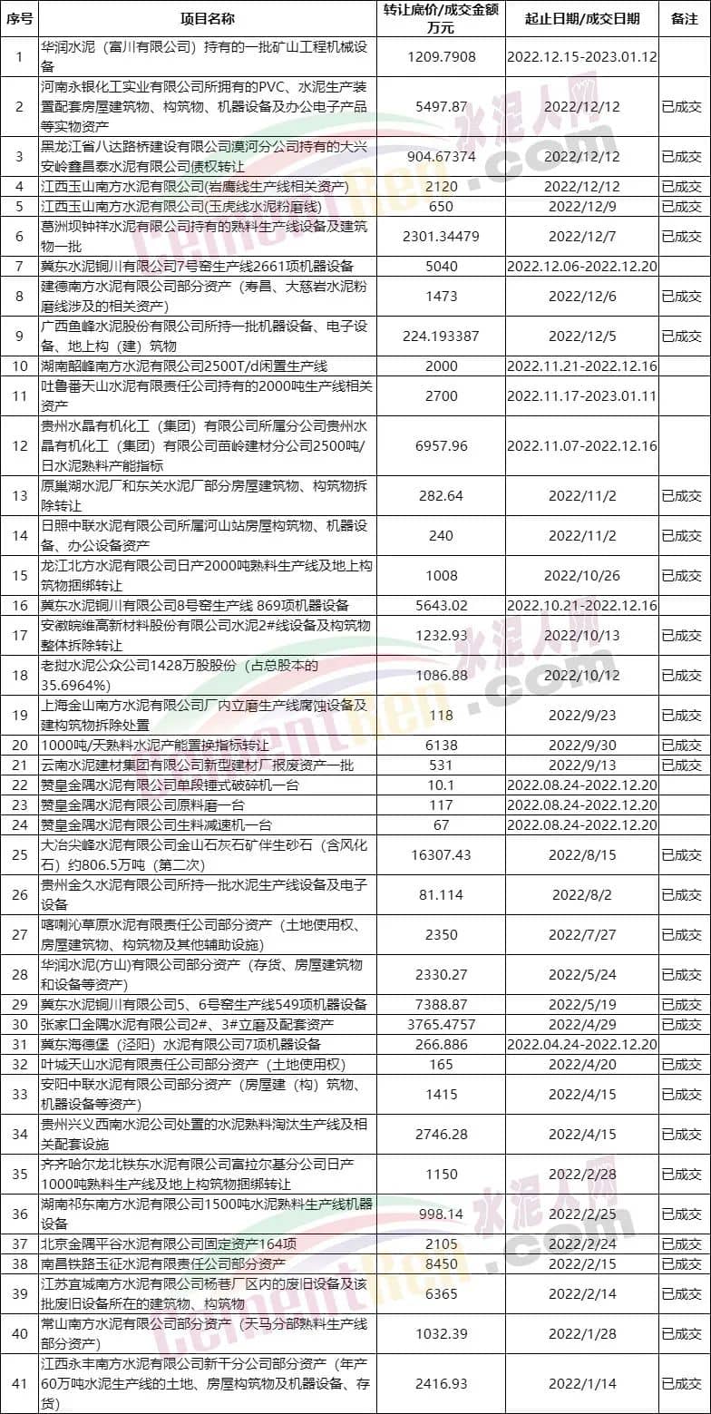 除上述水泥企業股權公開交易外,更多企業為清退無效、低效資產在產權交易平臺公開出售旗下設備、土地、礦山以及產能指標等。涉及企業不僅包括中國建材集團旗下水泥企業也包含金隅冀東、華潤、葛洲壩、尖峰、魚峰等行業龍頭企業,涉及金額超10.69億。