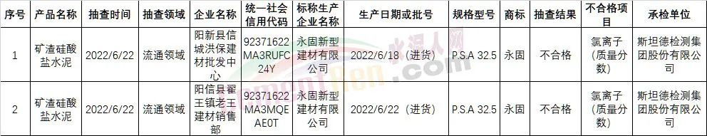 山東省濱州市市場監管局公布2022年水泥產品質量市級監督抽查結果。本次抽檢20批次水泥產品,標稱為同一家生產企業2批次“永固”牌P.S.A32.5水泥抽檢氯離子不合格。