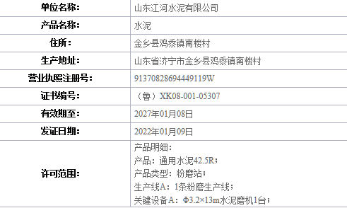 山東江河水泥有限公司生產許可證編號(魯)XK08-001-05307,有效期至2027年1月8日,企業類型為粉磨站;企業擁有1條粉磨生產線;關鍵設備為Φ3.2×13m水泥磨機1臺;企業“恒誠”商標已注冊。