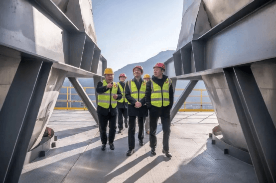 周育先現場考察了建德南方一期5000t/d熟料水泥生產線,先后踏看了窯頭平臺、預熱器、生料磨車間和水泥自動包裝系統,了解優化升級項目一年來的運行情況,詳細詢問新裝備新技術的運用和智能化場景應用,對各項技術指標給予充分肯定。