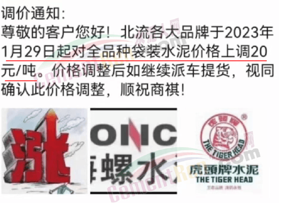 南寧區域水泥經銷商發調價通知稱,自2023年1月29日對紅獅、臺泥、魚峰、潤豐、海螺等各規格包裝水泥價格在原基礎上上調20元/噸,同時提示散裝水泥不漲價。