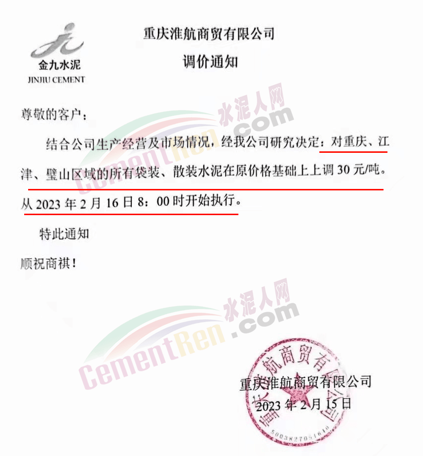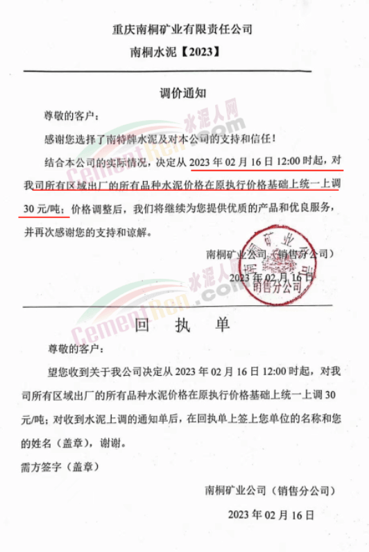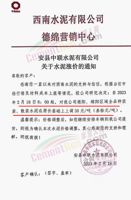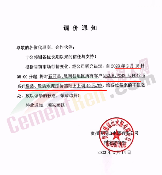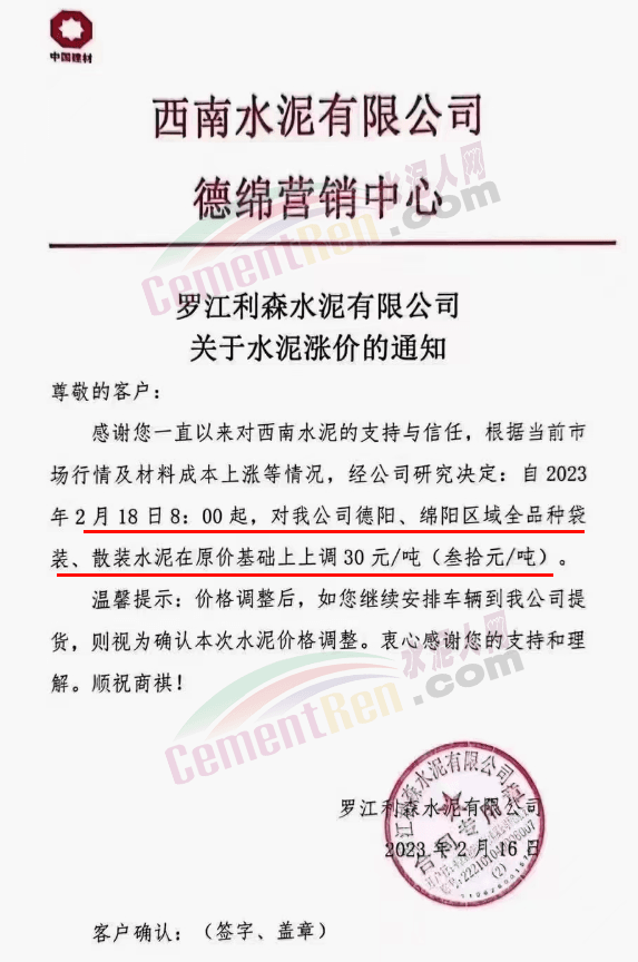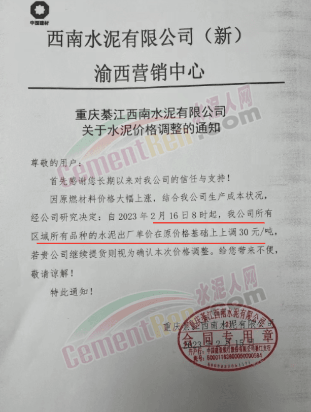 水泥人網通訊員消息,近日 ,西南地區四川、重慶、貴州多地主要品牌企業通知上調水泥價格20-30元/噸。