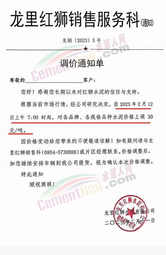 臺泥(英德)公司通知針對廣東省全區域熟料價格自2月9日起上調10元/噸;深圳、東莞、惠州、廣州東各標號散裝水泥上調10元/噸,散裝水泥中轉庫交貨同步上調。