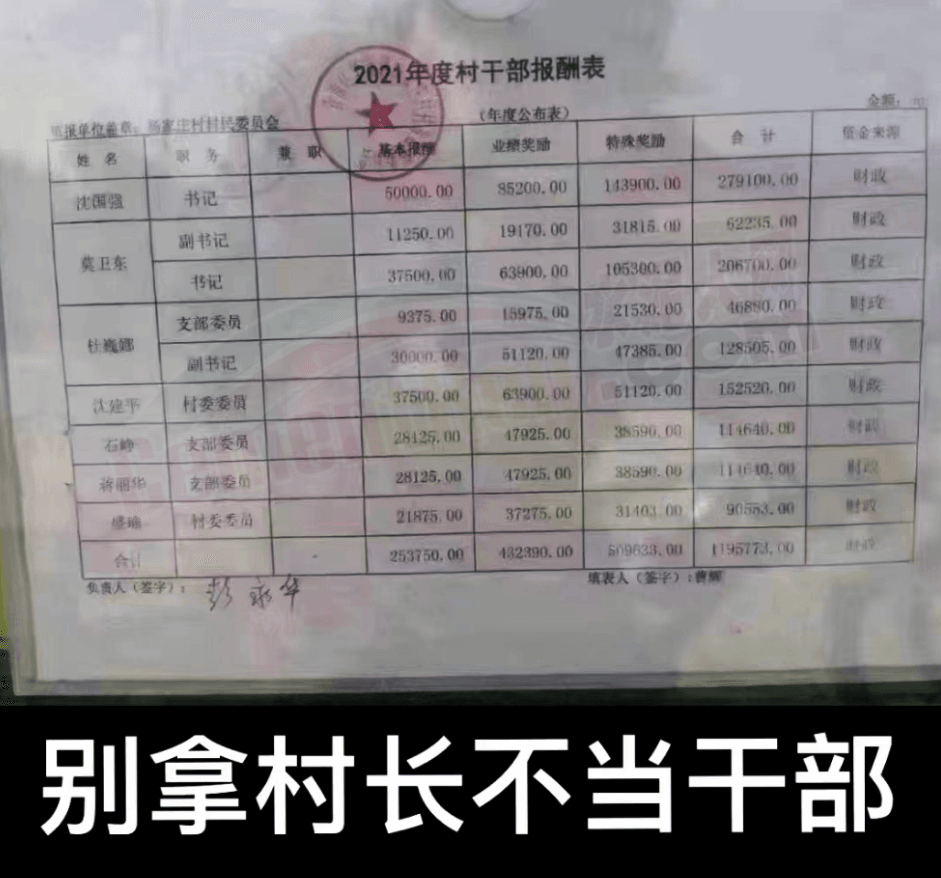 不久前,一份村干部報酬表在網(wǎng)上熱傳,水泥人網(wǎng)注意到,填報單位寫著某村民委員會,列出了2021年度書記、副書記、村委委員、支部委員等七位村干部的報酬明細。