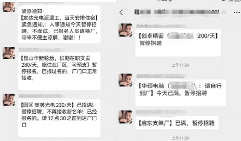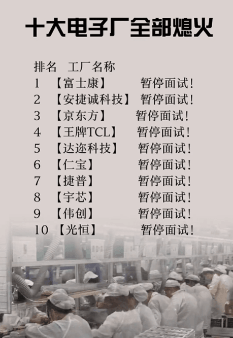 長沙比亞迪全部停招,蘋果昌碩科技暫停招募代工,蘇州立訊已經停招,成都5大工廠(富士康、京東方、仁寶、偉創、捷普)基本都已“熄火”,目前現在廠里都飽和了,要十幾個人,都能去一百多人。