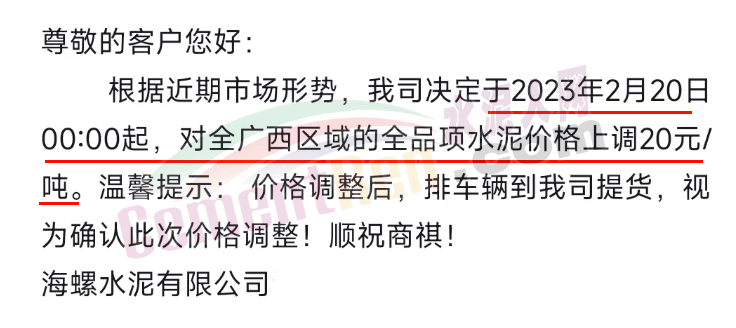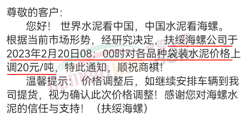 海螺水泥通知,于2月20日0時起,對廣西區域全品項水泥價格上調20元/噸。并提示,價格調整后,若繼續安排車輛提貨,視為確認此次價格調整。