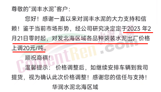 華潤水泥北海區域通知,2月21日零時起,對發北海各品種袋裝水泥出廠價格上調20元/噸。