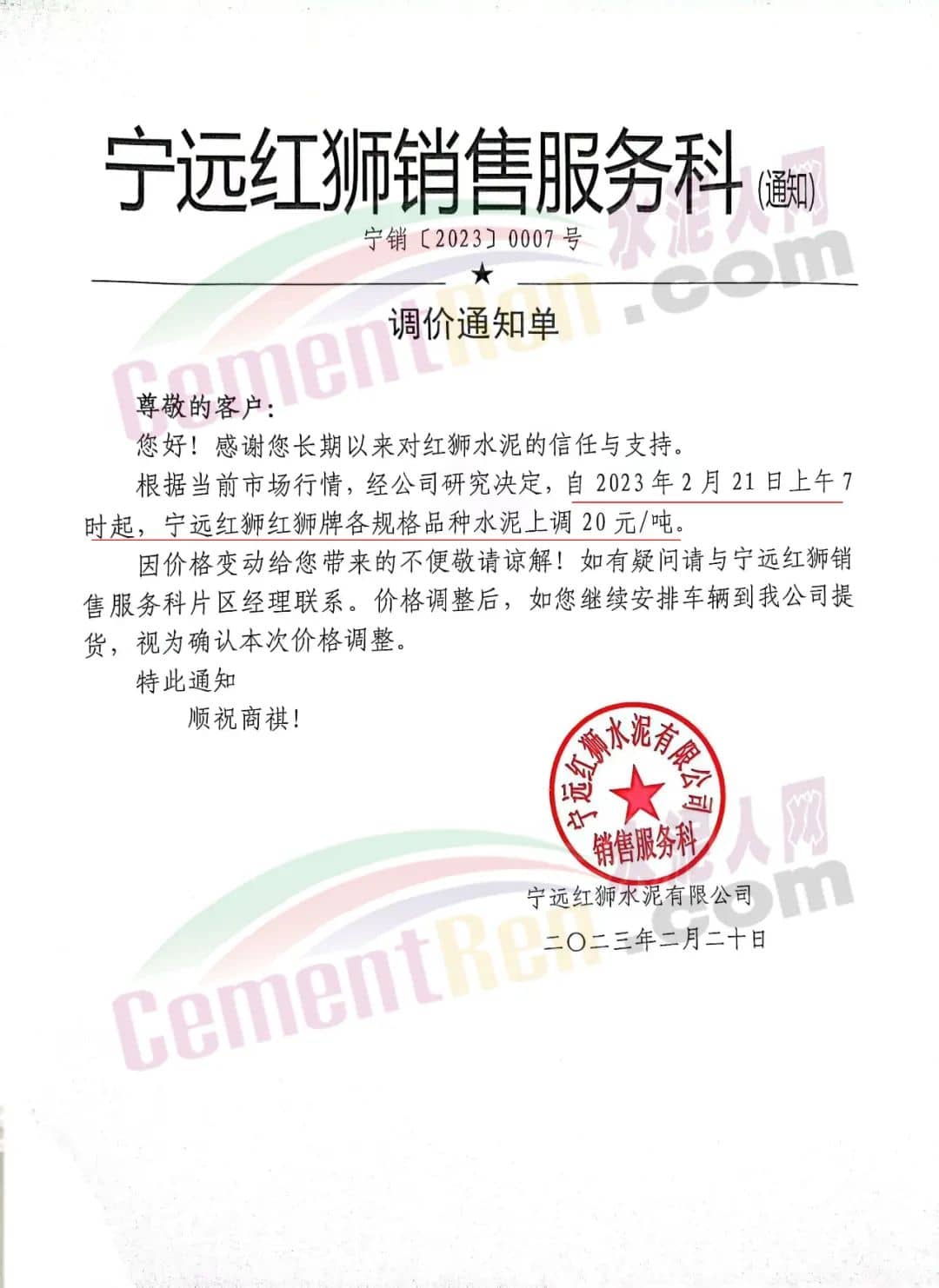 日前,寧遠紅獅銷售服務科通知,根據當前市場行情 ,經公司研究決定自2月21日上午7時起,寧遠紅獅紅獅牌各規格品種水泥上調20元/噸。
