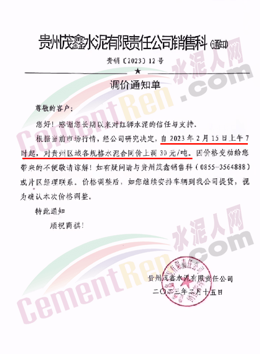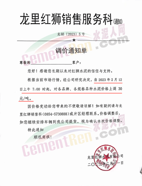 龍里紅獅水泥有限公司銷售服務科通知,自2月12日早上7時起,對各品牌、各規格品種水泥價格上調30元/噸。