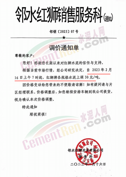鄰水紅獅水泥通知,2月16日上午7時起,紅獅牌各規格水泥上調30元/噸。