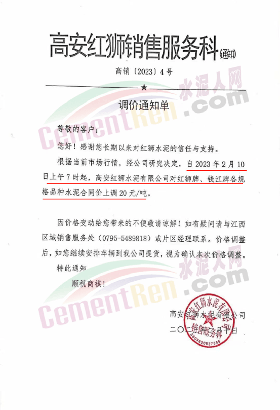高安紅獅銷售服務科通知,2月10日上午7時起,高安紅獅水泥對紅獅牌、錢江牌各規格品種水泥合同價上調20元/噸。