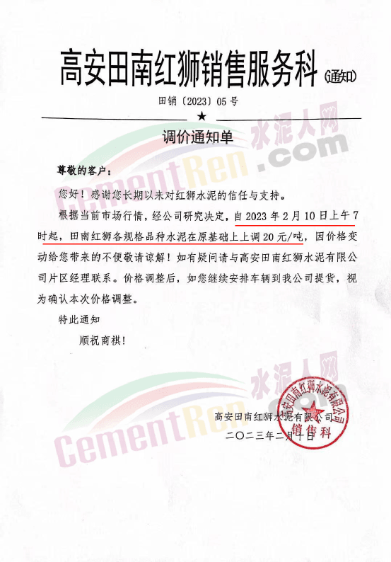 高安田南紅獅銷售服務科通知自2月10日上午7時起,田南紅獅各規格品種水泥在原基礎上上調20元/噸。