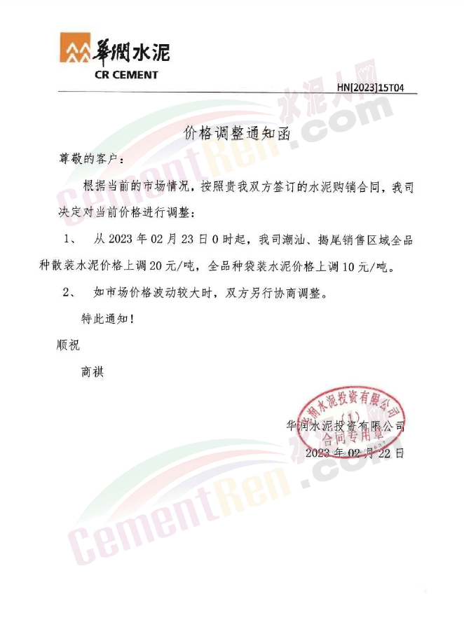 華潤(rùn)水泥(平南)有限公司通知,定于2023年2月20日12:00時(shí)起發(fā)平南市場(chǎng)各品種袋裝水泥價(jià)格上調(diào)20元/噸。