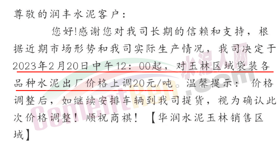 華潤(rùn)水泥玉林銷(xiāo)售區(qū)通知,2月20日中午12時(shí)起,對(duì)玉林區(qū)域袋裝各品種水泥價(jià)格出廠價(jià)上調(diào)20元/噸。