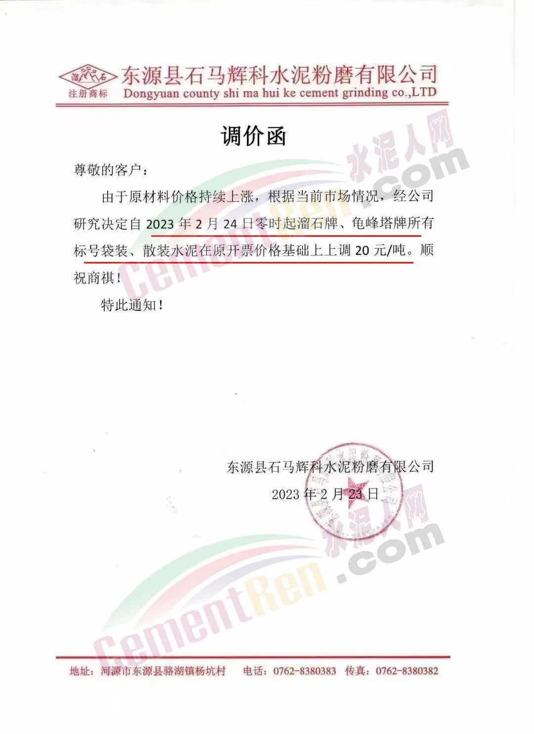 東源縣石馬輝科水泥粉磨有限公司通知,由于原材料價格持續上漲,根據當前市場情況,經公司研究決定自2023年2月24日零時起溜石牌、龜峰塔牌所有標號袋裝、散裝水泥在原開票價格基礎上上調20 元/噸。