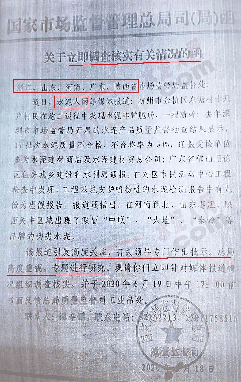 國家市場監督管理總局以及各地市場監督管理局對于水泥質量萬里行組委會活動高度重視。2020年6月中旬,國家市場監管總局發文給浙江、山東、河南、廣東、陜西等省市場監管局監督處稱,水泥人網相關報道中提及假冒偽劣水泥,引發高度關注,有關領導專門作出指示,總局高度重視,專題進行研究。同時,國家市場監管總局、工信部等相關部門組成督查組進駐相關省份,進行實地督查。