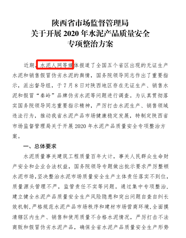 陜西省市場監督管理局水泥產品質量安全專項整治方案提到,水泥人網等媒體報道了全國五個省區出現的無證生產水泥和銷售假冒偽劣水泥的輿情,國務院領導同志作出了重要指示,派出督導組對陜西地區存在無證生產、銷售水泥和假冒品牌偽劣水泥等問題進行調查。為認真貫徹落實國務院領導同志重要指示精神,嚴厲打擊水泥生產、銷售領域違法行為,推動陜西省水泥產品市場健康穩定發展,特制定水泥產品質量安全專項整治方案。