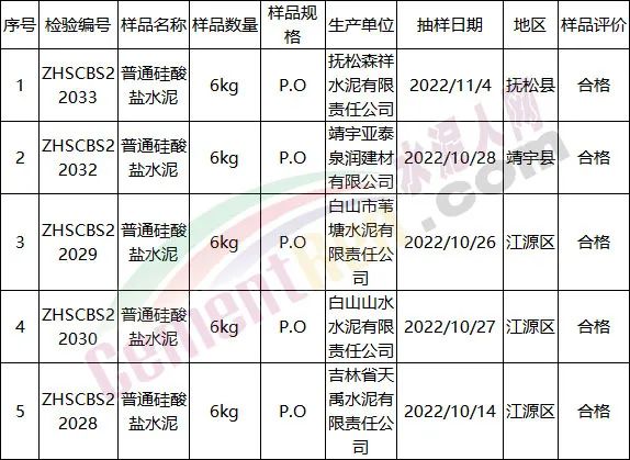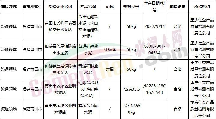 福建省莆田市2022年流通領域建材及裝飾裝修產品類商品質量市級監督抽查,水泥產品抽查5個批次全部合格。