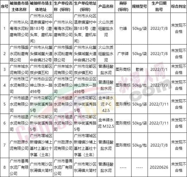 廣東省廣州市市場監督管理局水泥產品質量監督抽查,共抽查了8批次樣品,經檢驗全部產品符合標準要求。