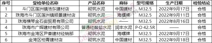 廣東省珠海市市場監督管理局共抽查了6家企業銷售的6批次水泥產品。經檢驗,未發現質量不合格產品。