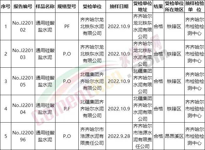 黑龍江省齊齊哈爾市市場監管局抽查水泥產品5批次,全部合格。