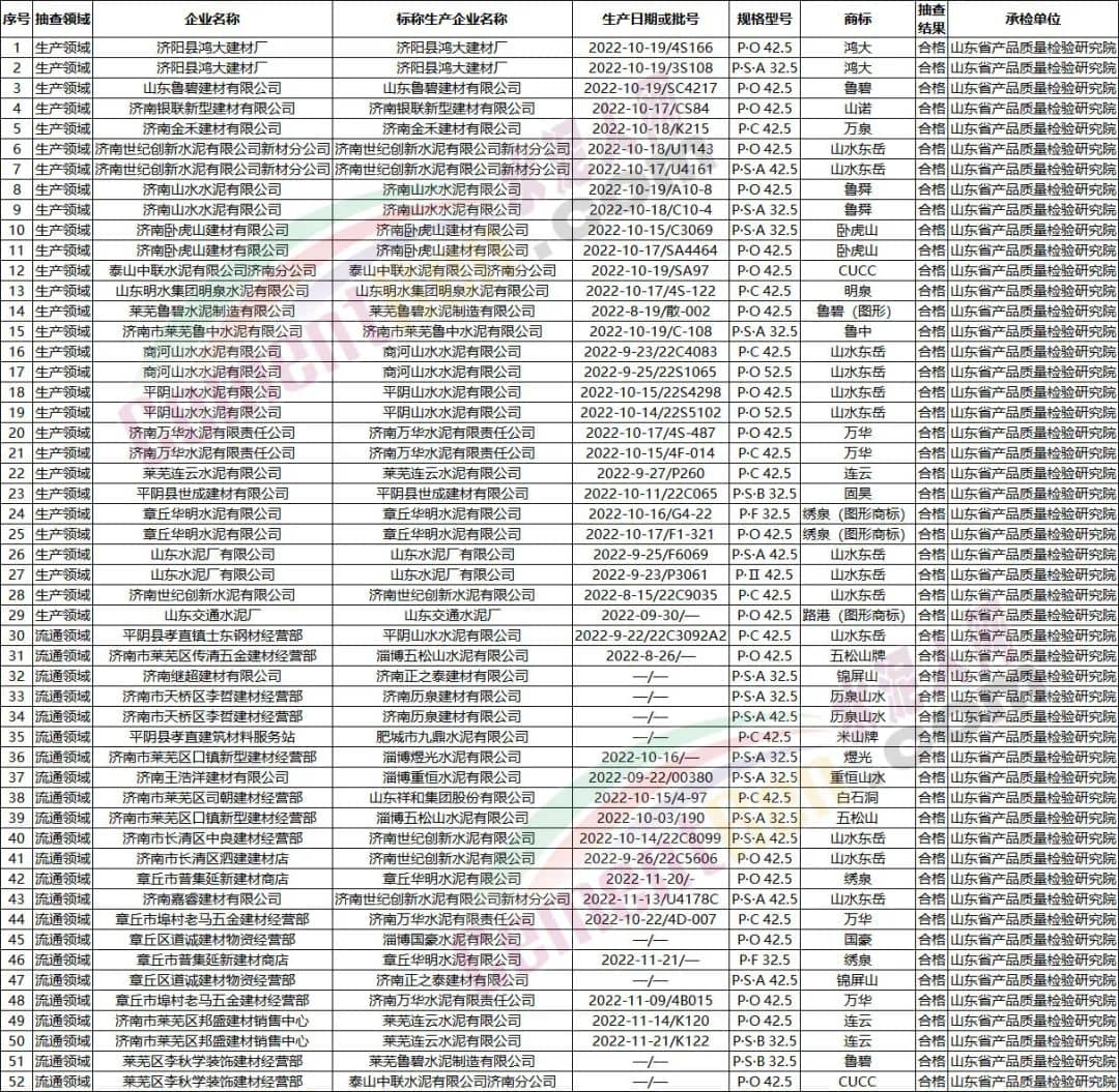 山東濟南2022年水泥產品質量監督抽查未抽到企業匯總表
