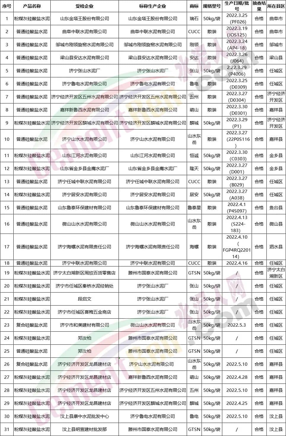 山東濟寧共抽查31家企業的31批次水泥產品,其中生產領域18批次,流通領域13批次。經過結果判定,抽查的31家企業的31個批次產品,合格31批次,抽查合格率100%。