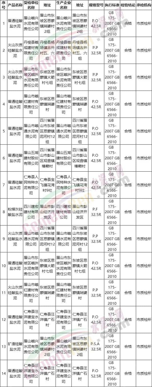 四川省眉山市市場監督管理局第四批工業產品質量市級監督抽查共抽查水泥14批次,全部合格。