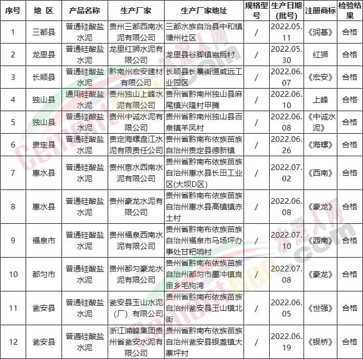 貴州省黔南州市場監管局生產領域產品質量州級監督抽查,共抽檢12批次水泥,全部合格。