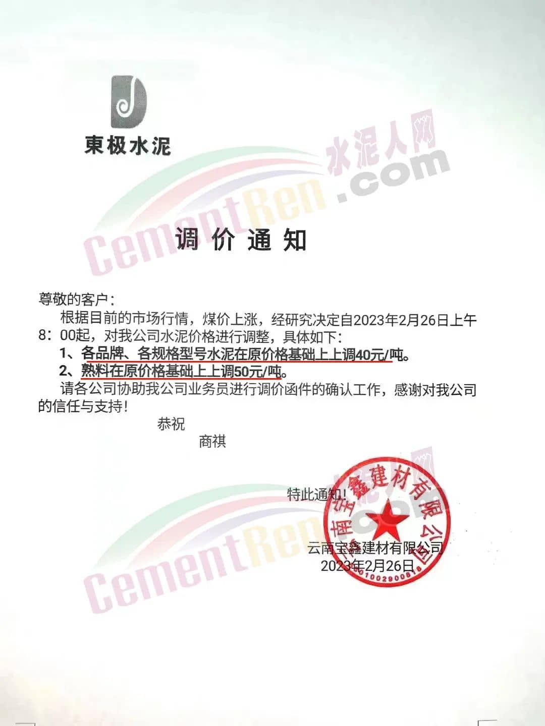 水泥人網通訊員消息,日前,云南寶鑫建材有限公司通知,根據目前的市場行情,煤價上漲,經研究決定自2023年2月26日上午8起,對公司各品牌、各規格型號水泥在原價格基礎上上調40元/噸;熟料在原價格基礎上上調50元/噸。