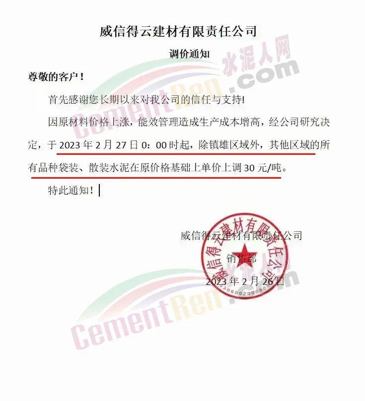 威信得云建材有限責任公司通知,因原材料價格上漲,能效管理造成生產成本增高,經公司研究決定,于2023年2月27日0時起,除鎮雄區域外,其他區域的所有品種袋裝、散裝水泥在原價格基礎上上調30元/噸。